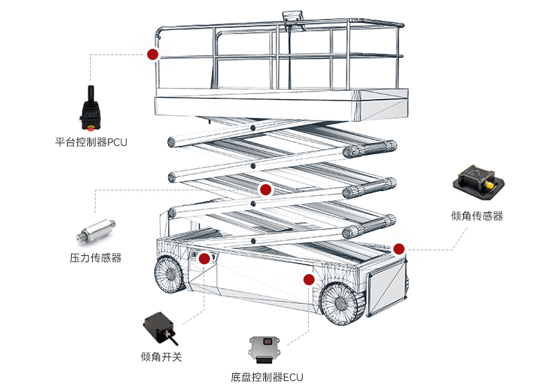 剪叉式高空作業(yè)平臺(tái)可實(shí)現(xiàn)平臺(tái)、底盤雙向行走升降,高低速控制功能等,具備防護(hù)功能以及高度、重量實(shí)時(shí)監(jiān)測反饋功能。系統(tǒng)ECU、PCU均配置大顯示屏,可實(shí)時(shí)顯示車速、高度、重量等信息,操作舒適、安全可靠,大大增加了系統(tǒng)適配性,維護(hù)成本降低。
